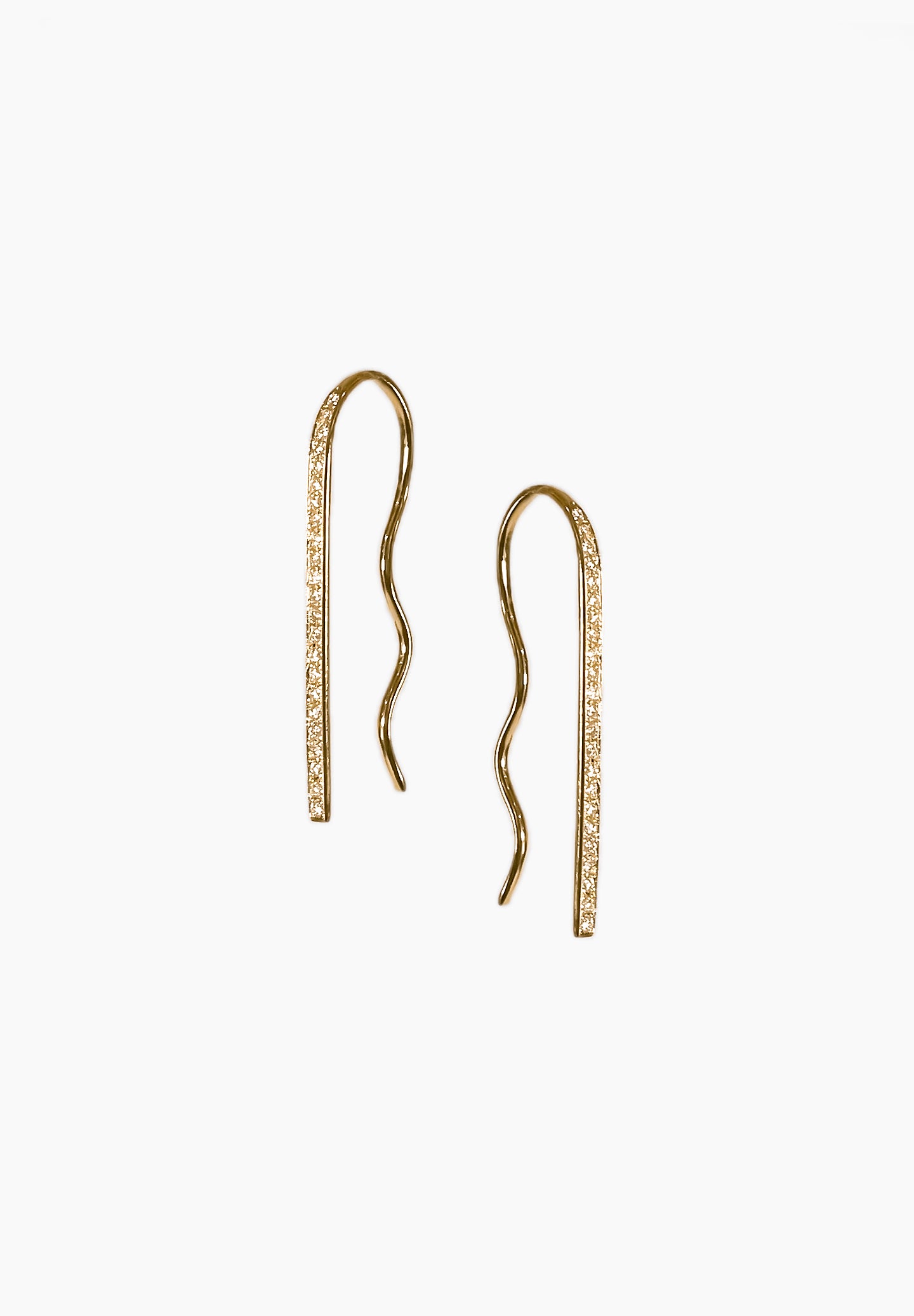 "Swan Lake" earrings are inspired by the ballet "Swan Lake".A version with a tiny diamond placed on the side facing the front when worn.. The shape of these earrings is inspired by hairpins, and is reminiscent of ballerina women and the way they wear hairpins in their hair. The undulating lines create a beautiful line, and when worn on the ear, it becomes an accent with even more presence. The K18 and diamonds give off a luxurious shine that is well-balanced whether you wear it in one ear or both ears.