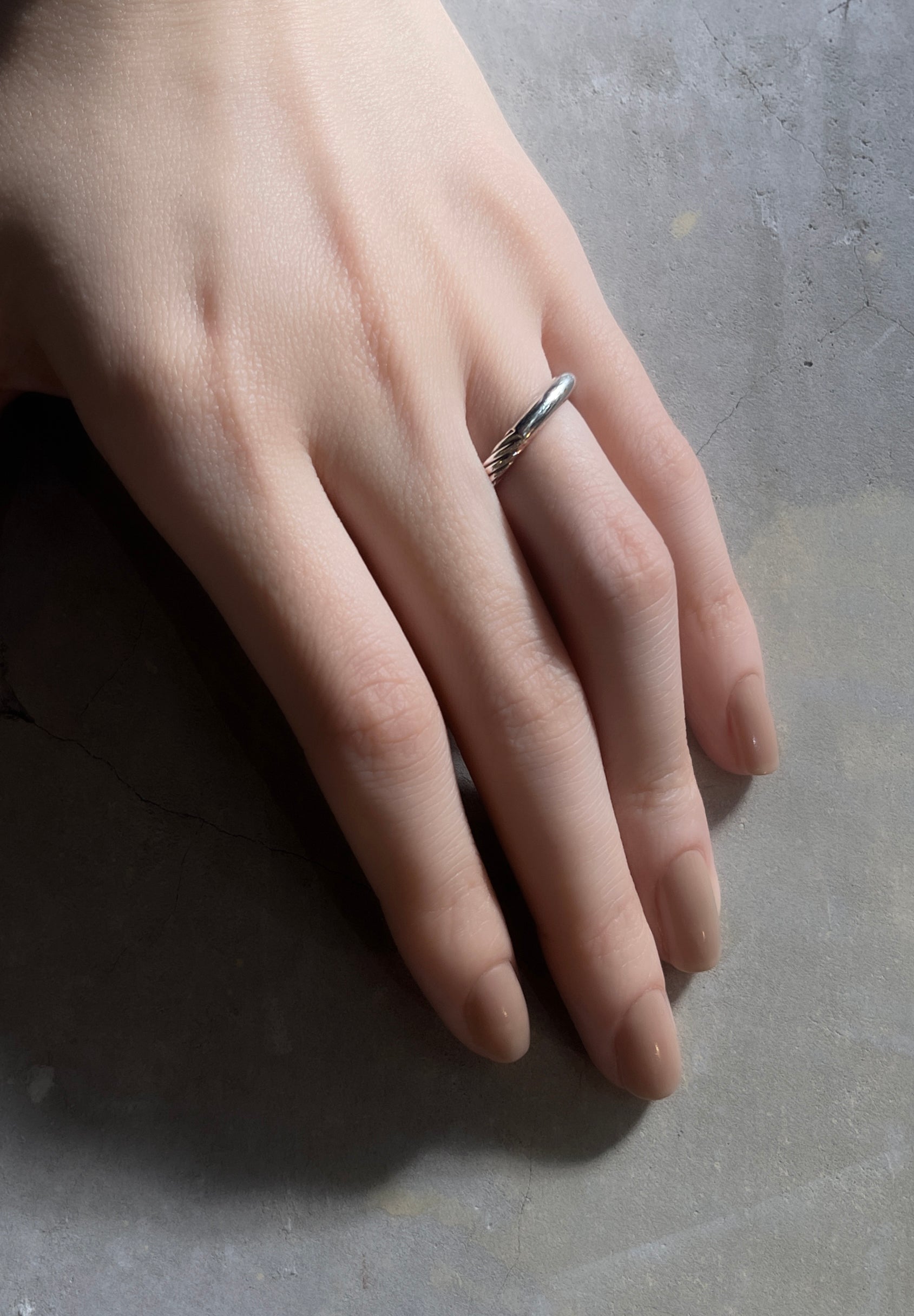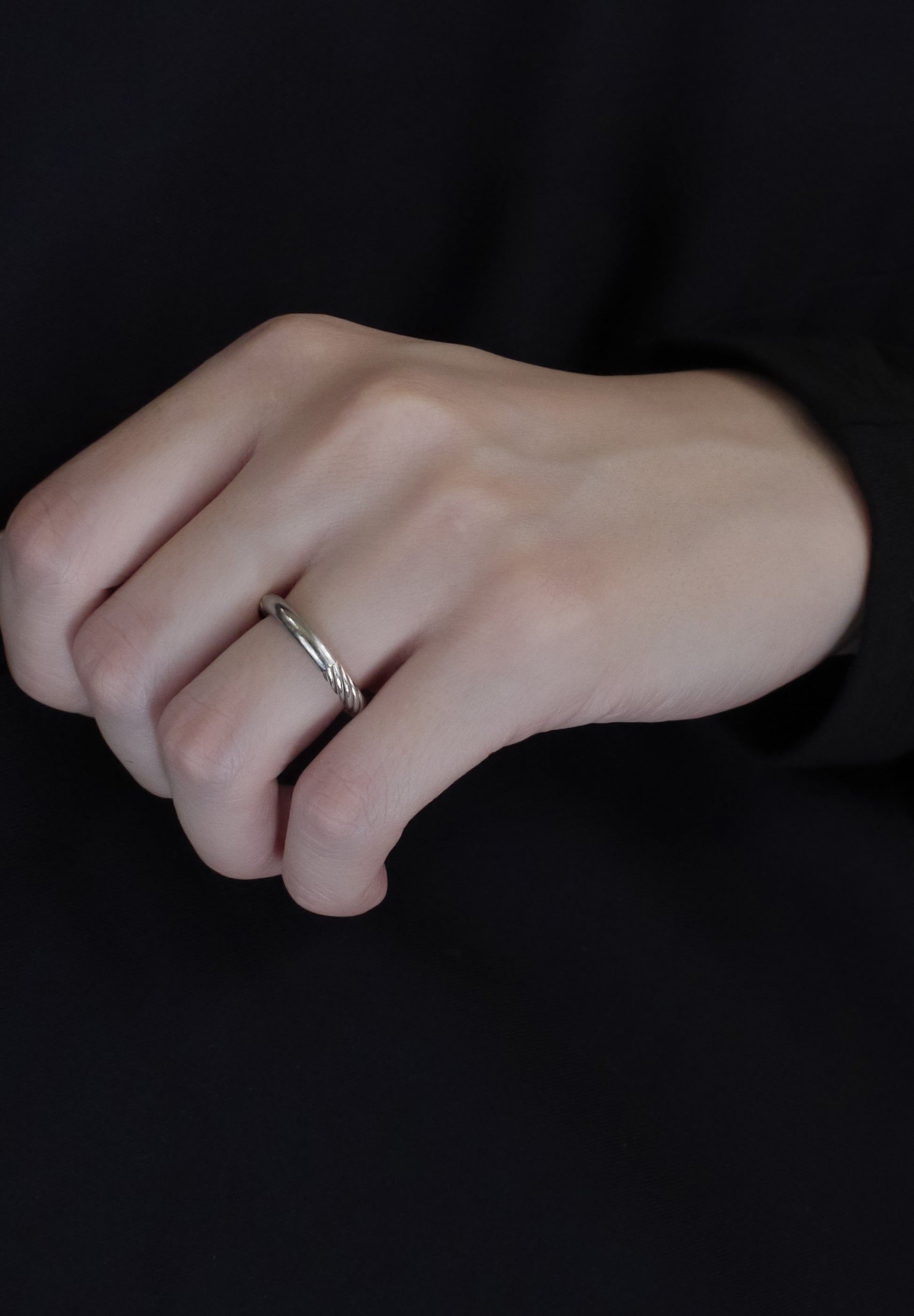 A ring made of twisted sterling silver wire and a mirrored part. The contrast of details is impressive. The decorativeness of the twisted parts and the glossy mirror surface give a minimalist yet solemn feel. A ring inspired by the paintings of painter Caravaggio. This item is also recommended as a wedding ring or pairing ring.