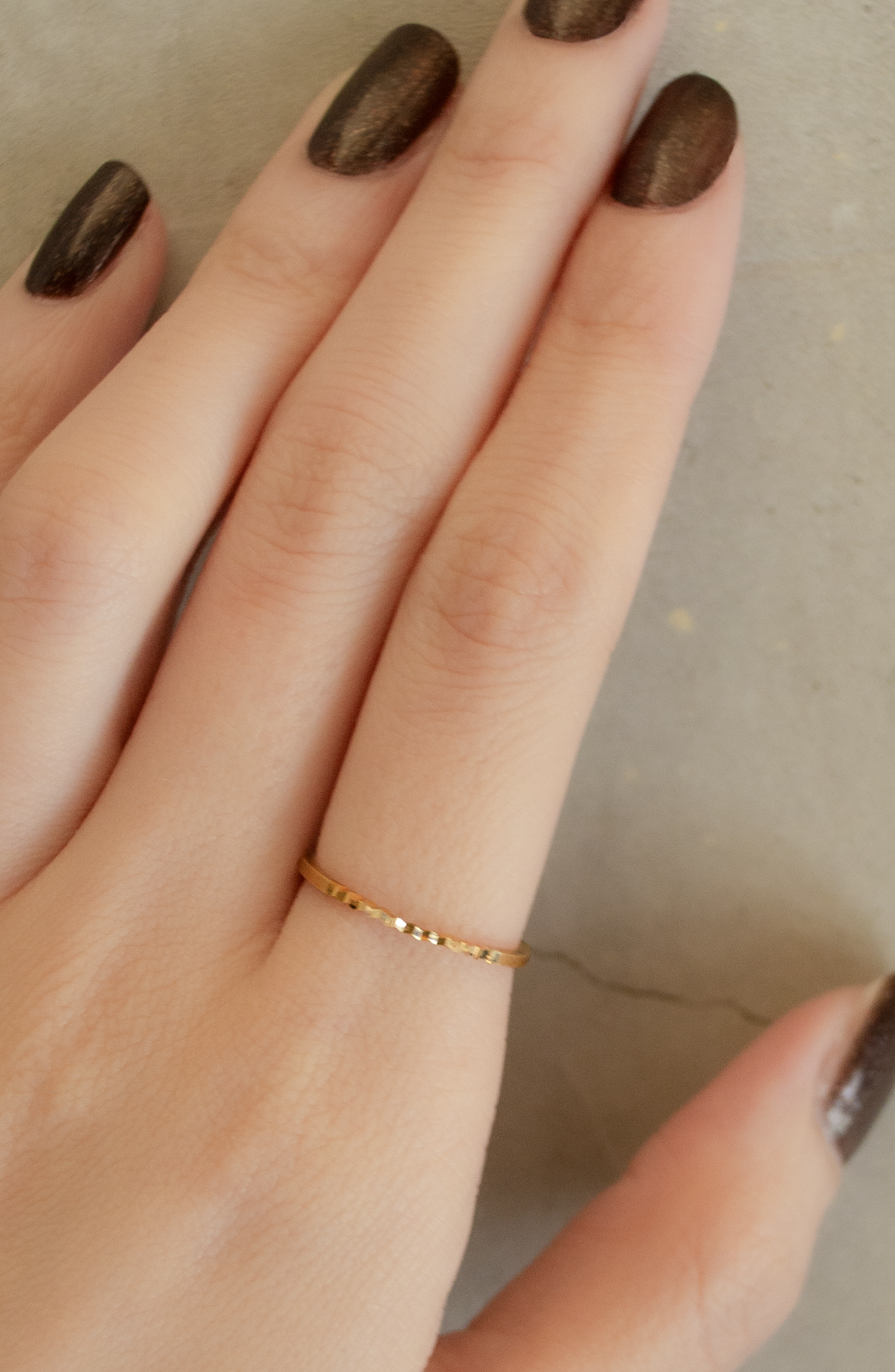 A Φ1.2mm square wire ring with a quarter section carved out and decorated. The round curved surface has a matte finish with a soothing texture, while the excavated portion has a rough but dazzling shine, creating a beautiful contrast between the two rings. It is carved with a special excavator, and the carved areas are dazzlingly reflective. This item was inspired by Radiohead's "Kid A" album.
