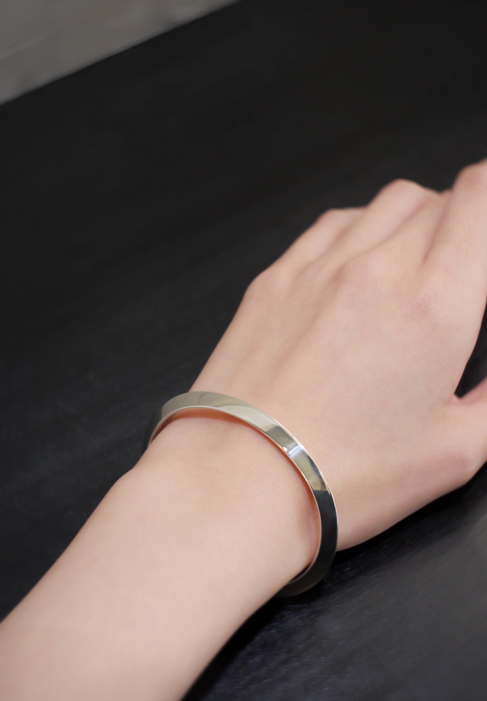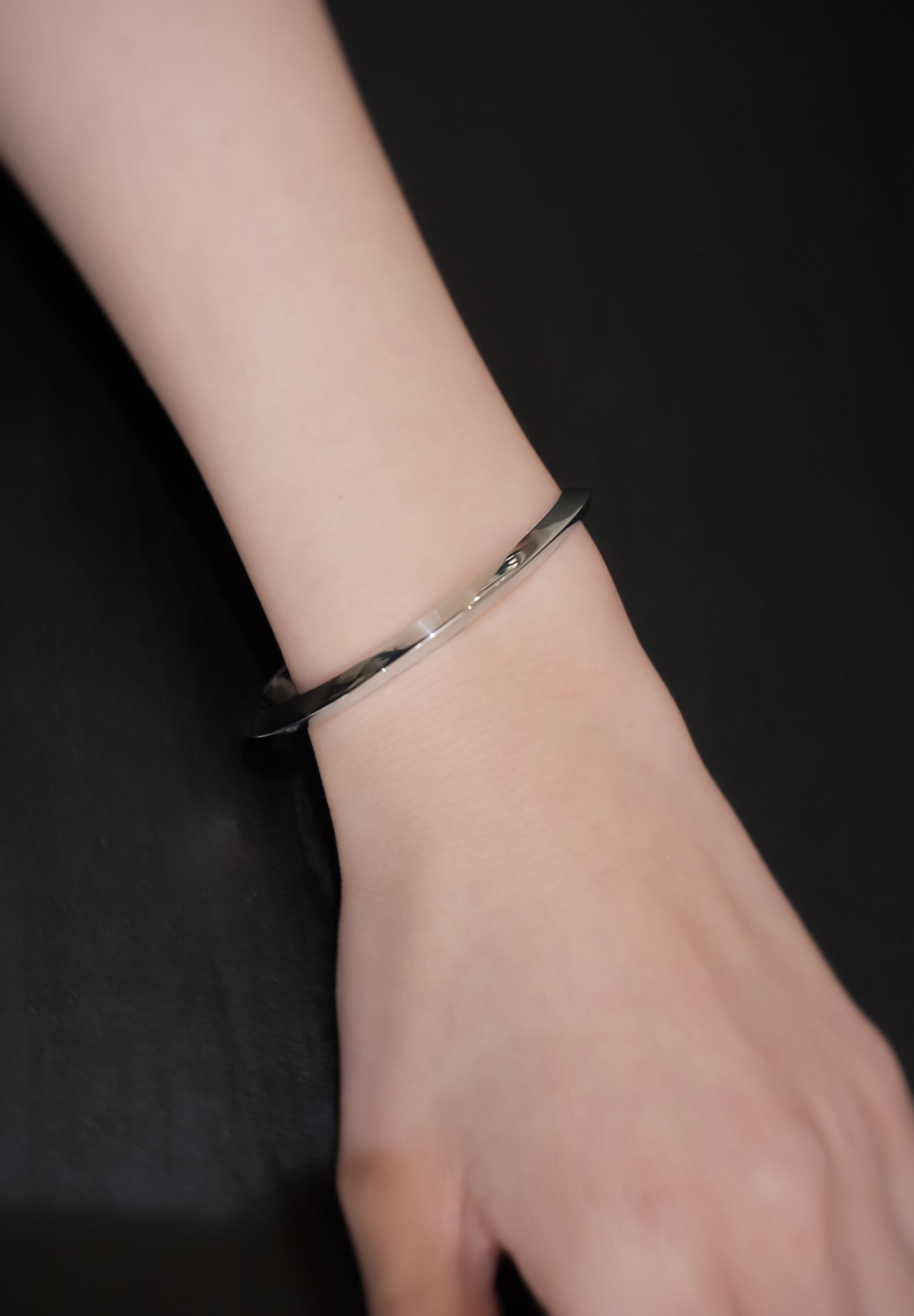 Holy. A bangle made of triangular wire with a diameter of approximately 5mm. Because the base metal is stretched and shaped, the surface is finished like a mirror without fogging, and it is made of high quality sterling silver that boasts extremely high strength. The design has a triangular corner at the top, giving it a decorative and edgy feel.