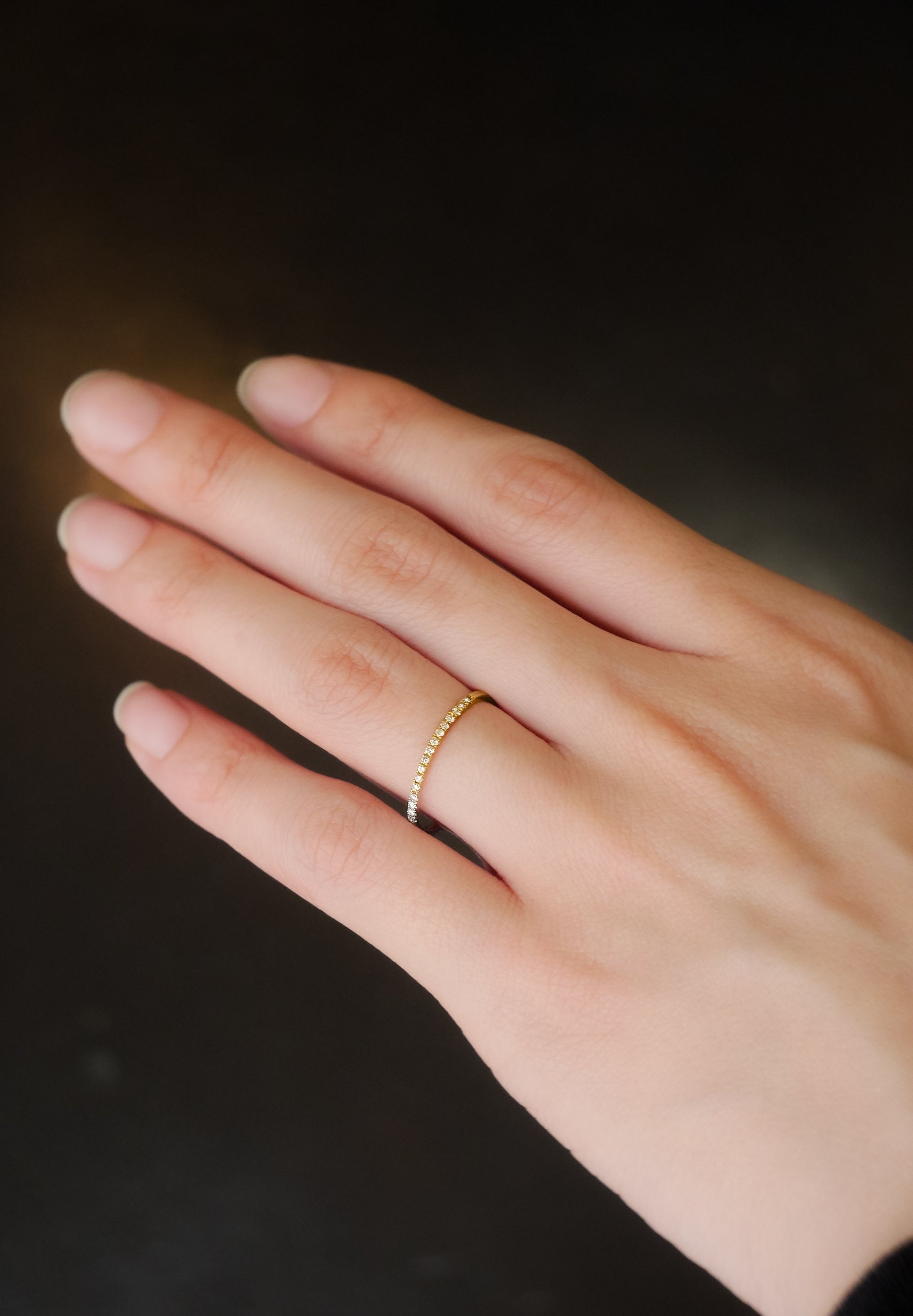 One half of the ring is platinum and the other half is 18k yellow gold. A square silhouette composed of square lines. This ring is often purchased as a pairing, and it has the meaning of sharing half with each other. In addition, diamonds are set in half of the ring (half circumference).