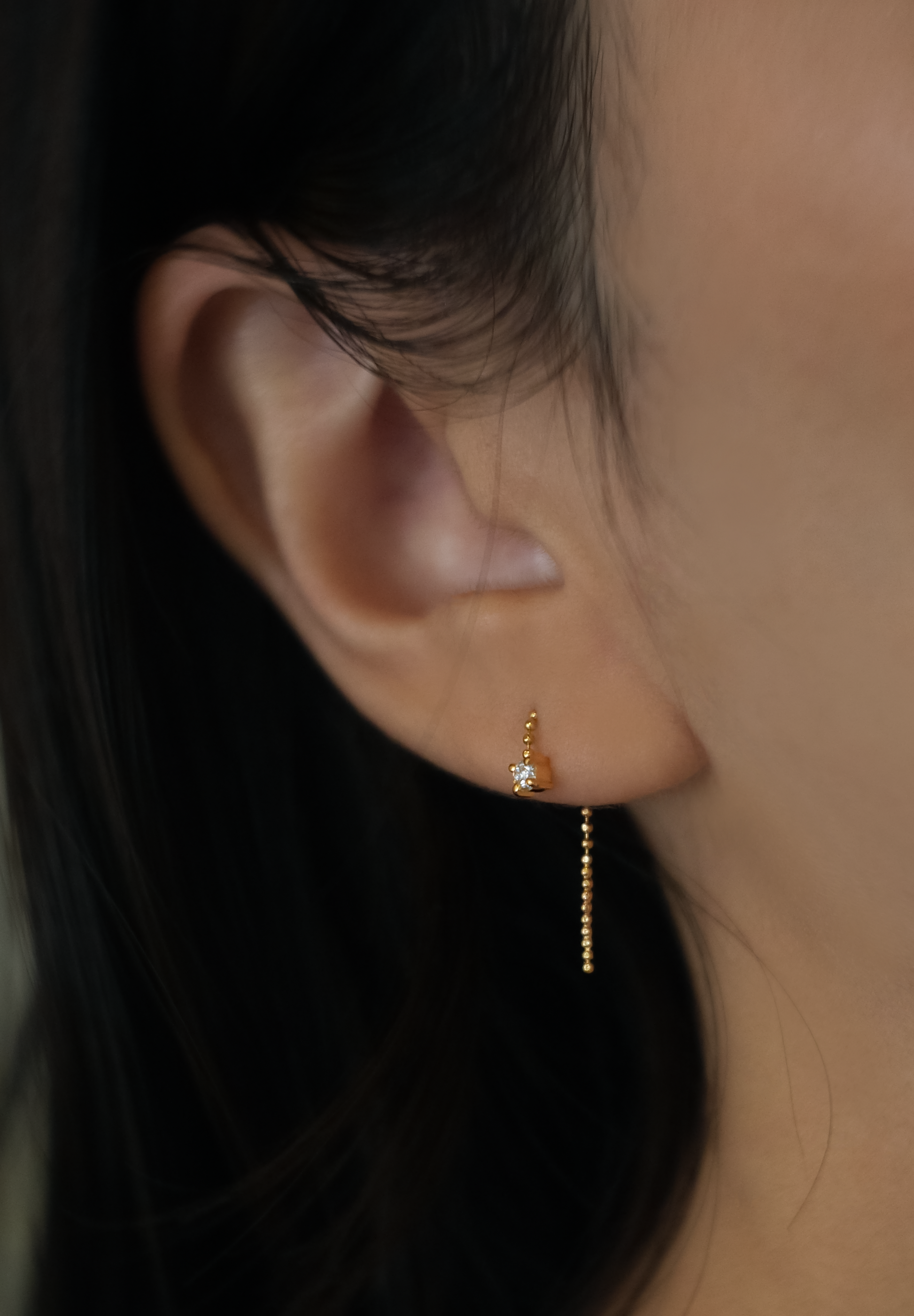チェーンの先端が直線の形状に固められており、装着時にポストの役割をはたします。チェーンの長さも耳に収まりが良く、上品な雰囲気のダイヤモンドのピアスです。カジュアルにも、フォーマルにもご活躍いただける、洗練されたパーフェクトな現代的デザイン。