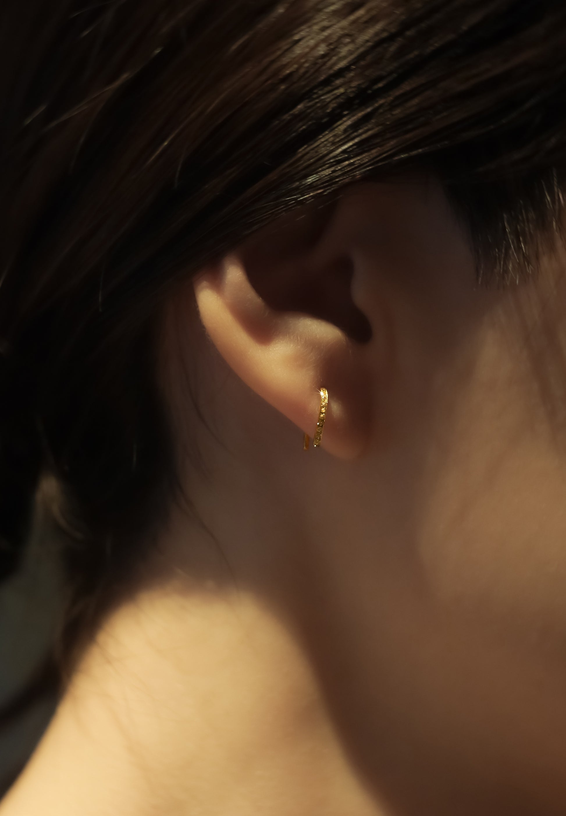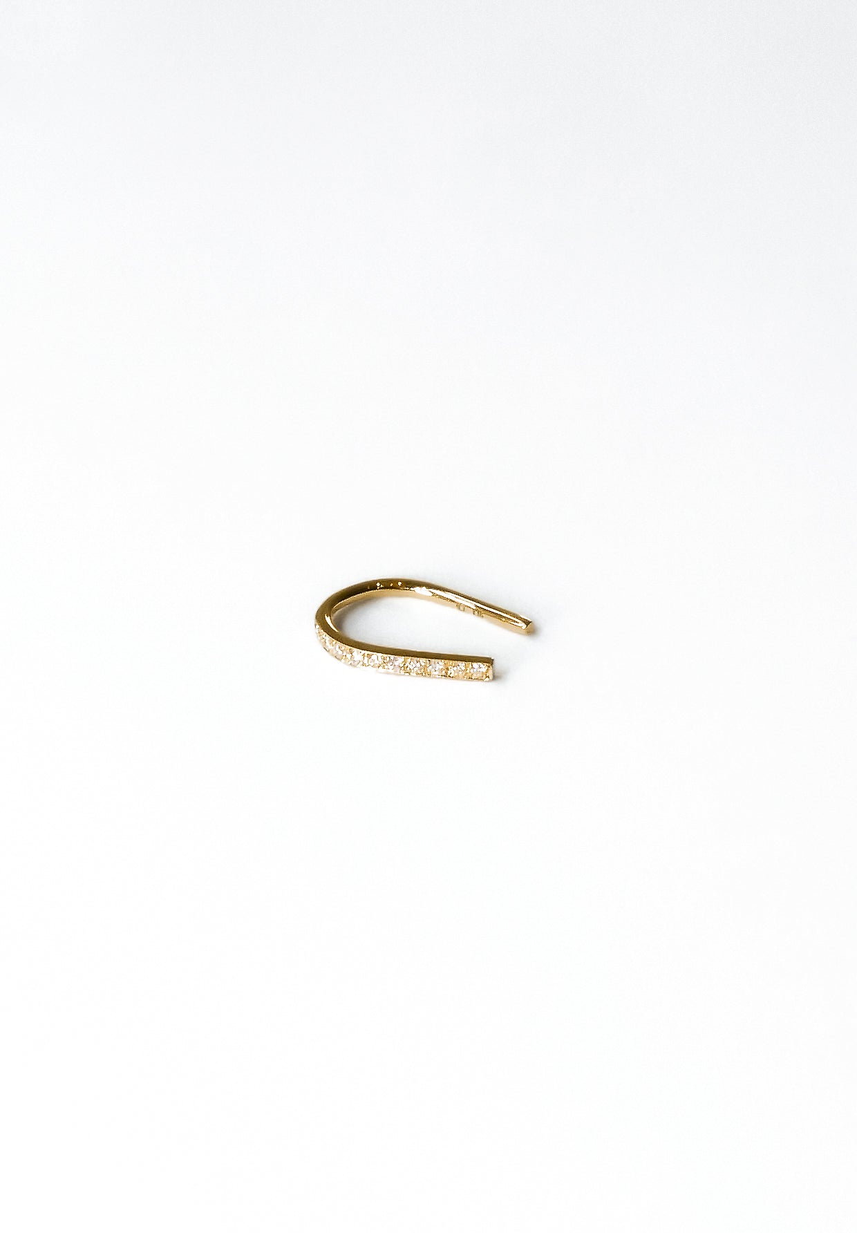 馬の蹄をモチーフにデザインされたピアス "Spartacus"の、装着時に正面に向く面に極小のダイヤモンドを据えたバージョン。馬蹄の堂々とした佇まいとシンプルで洗練されたシルエットは、耳たぶのピアスホールに通すだけで十分なホールド感を発揮します。K18とダイヤモンドのラグジュアリーな雰囲気をさりげなく演出できる究極にミニマルなアイテムです。