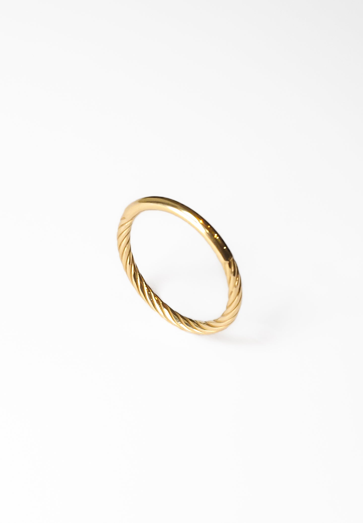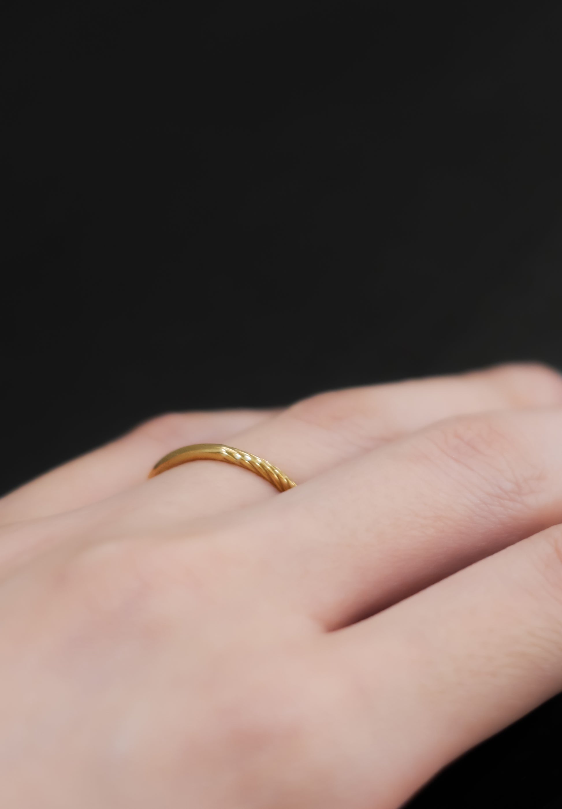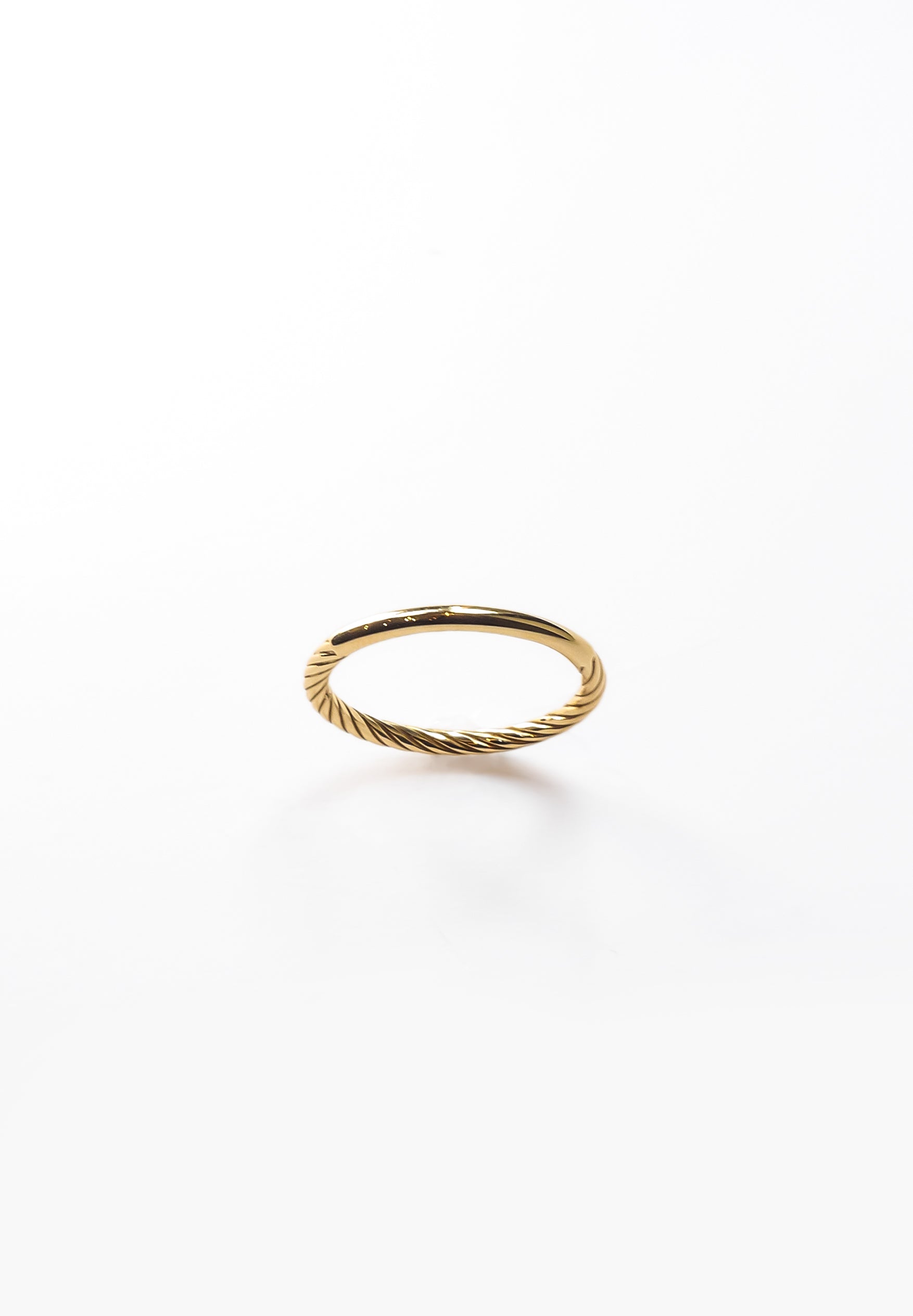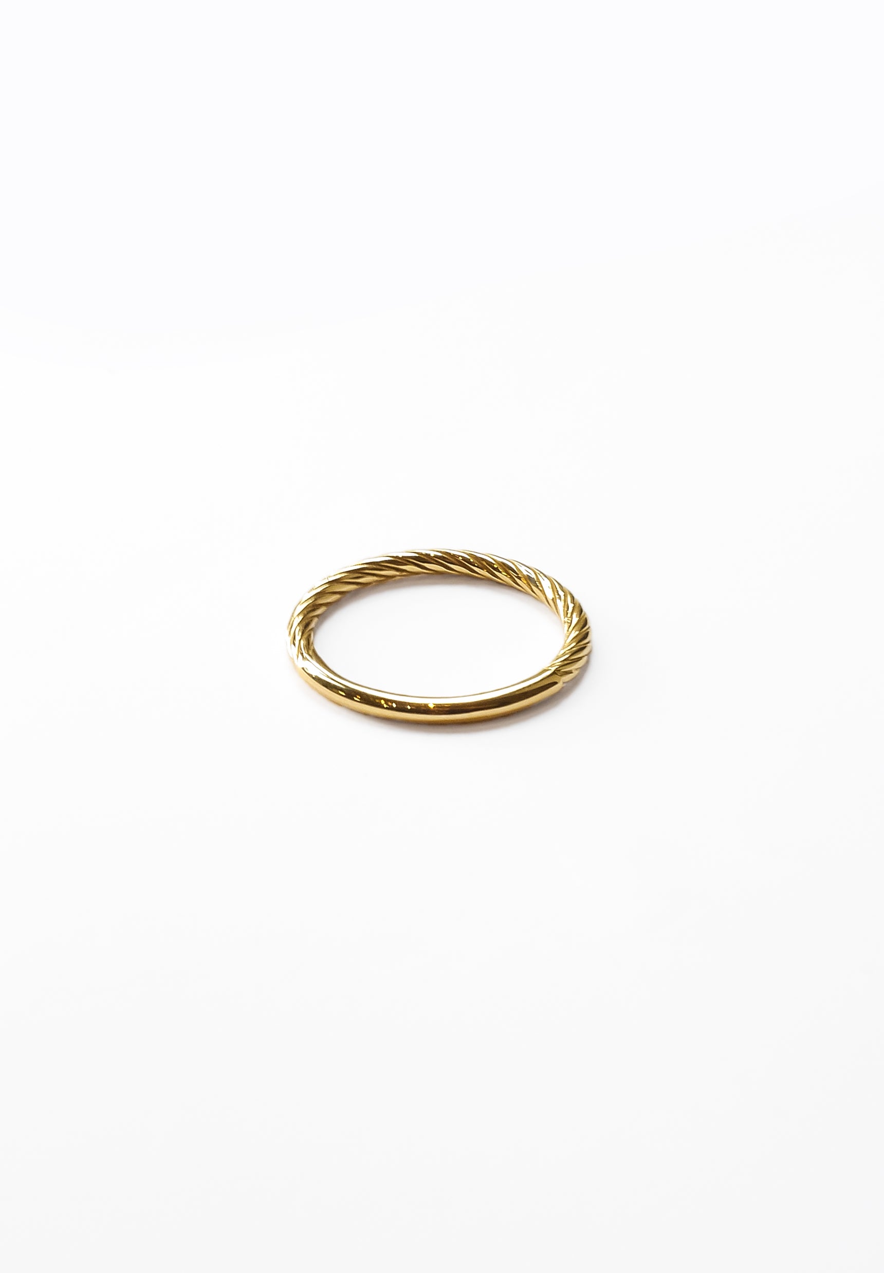 K18の線をねじったような彫りの入ったリングパートと、鏡面のパートとで構成されたリング。ディテールのコントラストが印象的。ミニマルながら荘厳さを感じられるねじり部分の装飾は陰影を強調し、K18の鏡面の艶やかさが引き立つクラシックなデザインのリングです。画家・カラヴァッジョの絵画をインスピレーションにデザインしています。