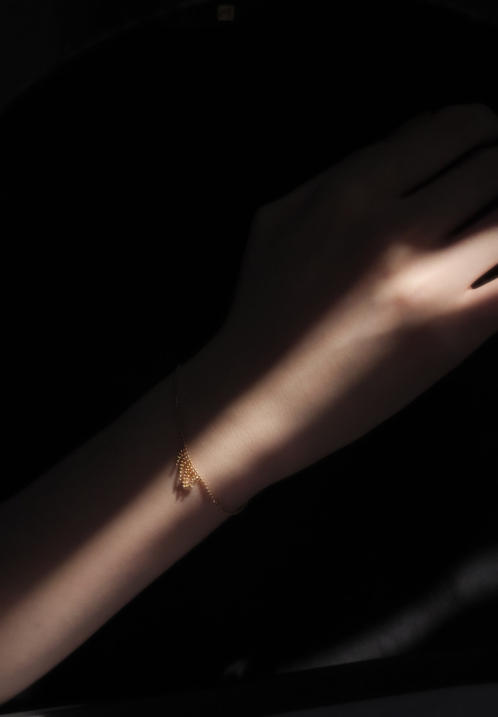 約1.0mmのボールカットチェーンが、房のように重なり、繋がり、美しいシルエットを形成しています。また、ボールチェーンを溶接し固める技術により、無駄を削ぎ落とした完全にミニマルなスタイルを実現させました。