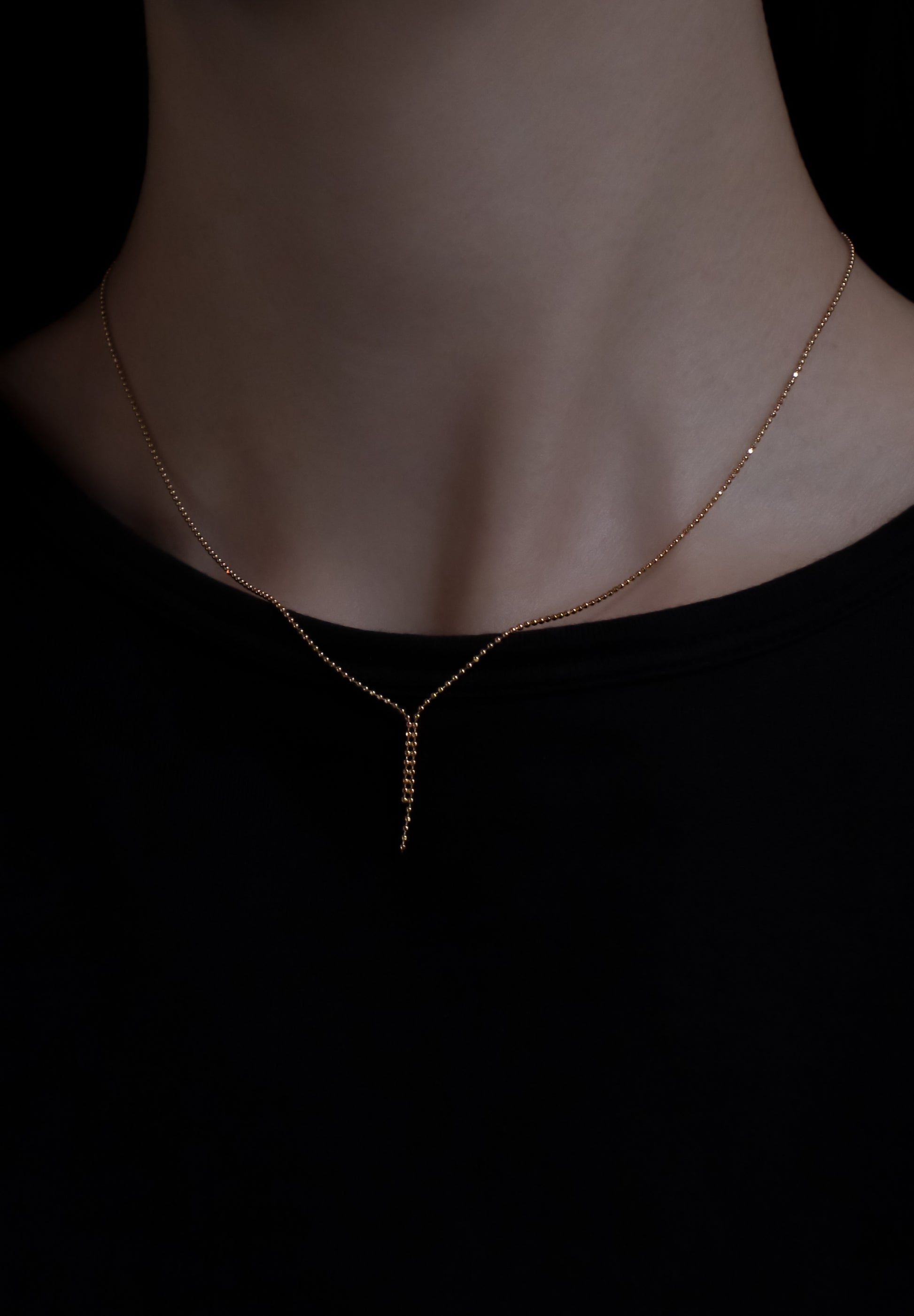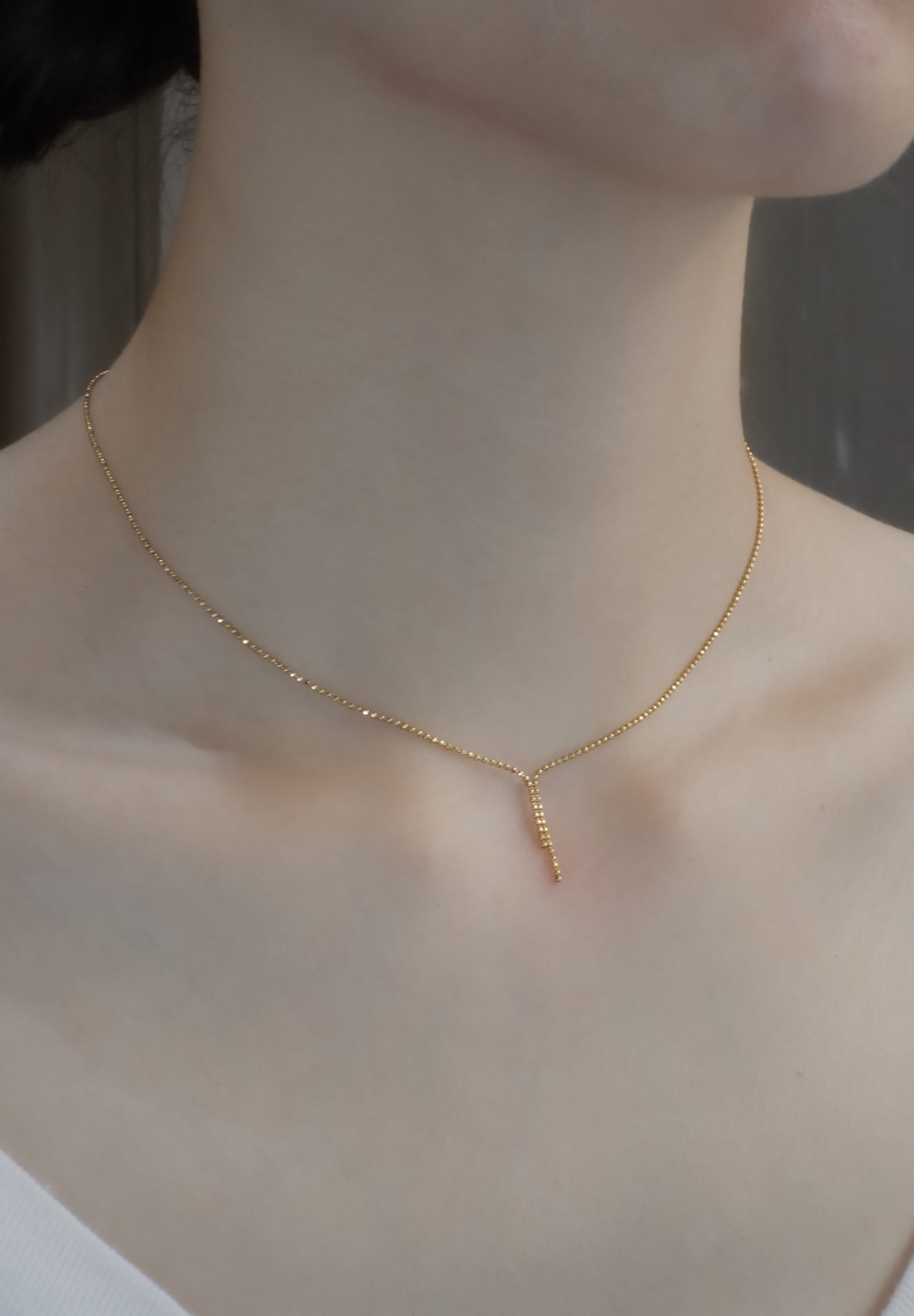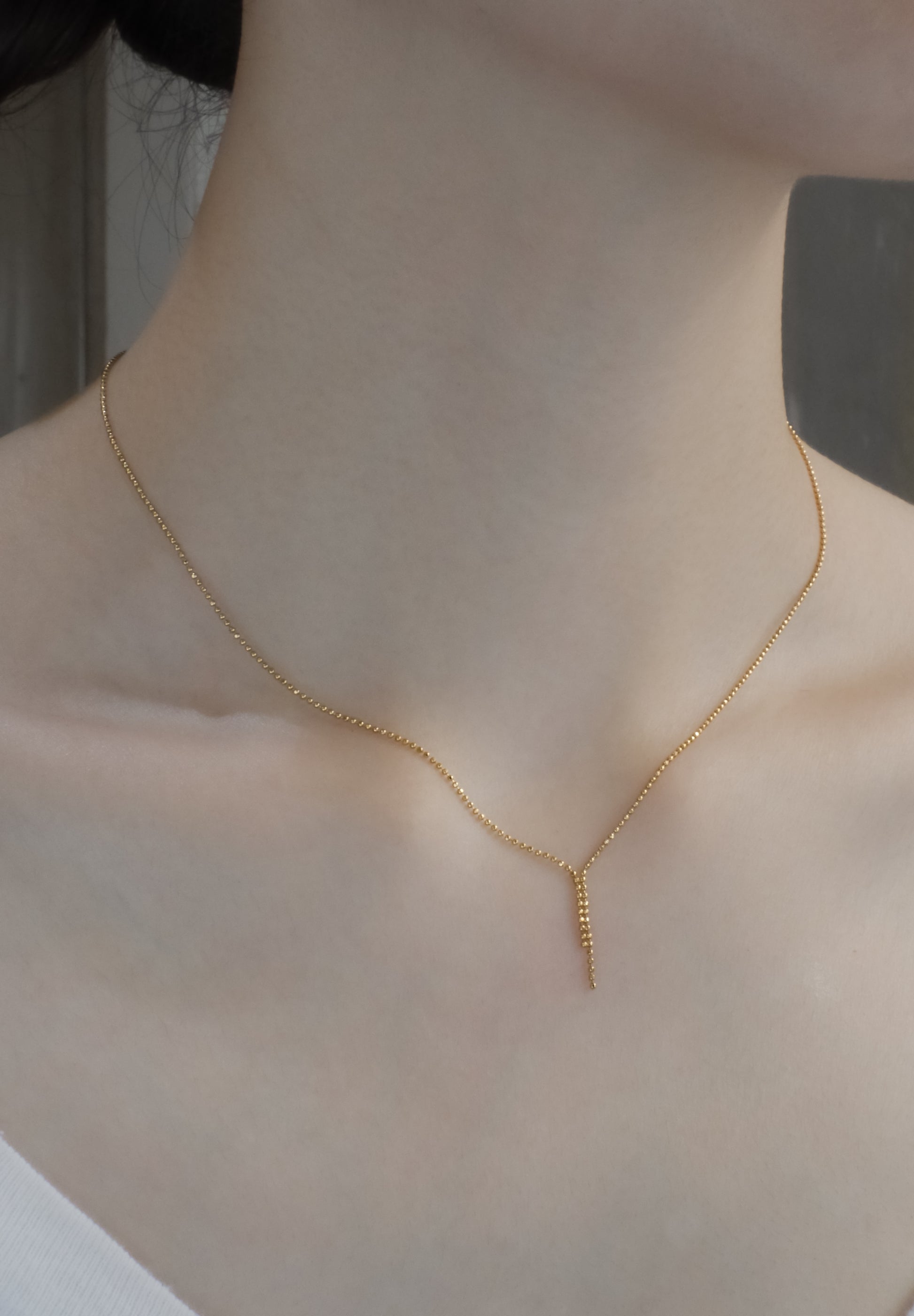 Tie Necklaceは縦長に流れるチェーンが流れる水の形のように配置され、上品かつクラシックな印象を与えます。